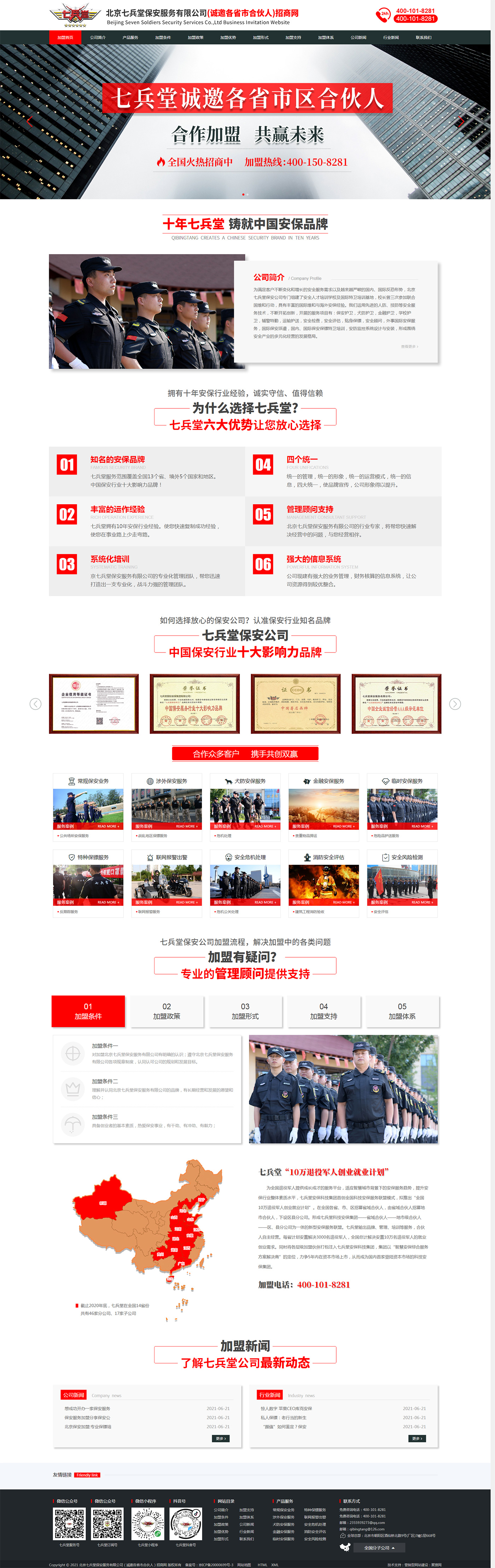 北京七兵堂保安服務有限公司是由7個退役特種兵發起的提供綜合、國際安保服務的企業,從2006年開始開展保安服務,2011年新的《保安服務管理條例》頒布實施之后,獲批《保安服務許可證》的正規合法新型民營安保服務企業,是中國開展新型綜合安全服務的企業,是目前集規范化、現代化于一體的綜合性新型安全服務企業,主要為企業和個人提供:保鏢護衛、裝備物資運送護送、咨詢和風險管理、安全系統設計與安裝及培訓服務。2013年與英國聯合安保公司在香港共同成立七兵堂國際安保集團有限公司,開展國際安全業務。